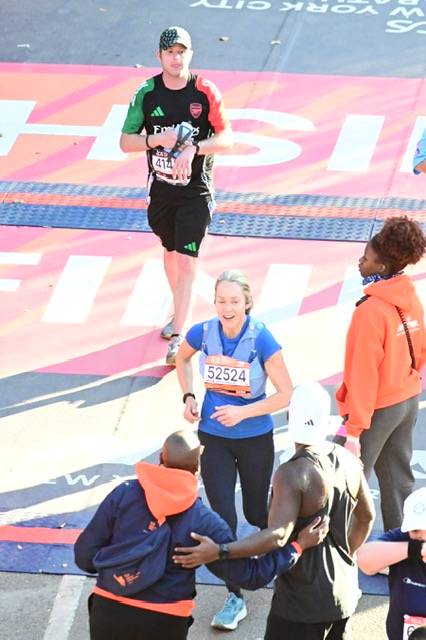 The training and the run were incredible and definitely in my top 5 experiences of my life. The training went really well. – perhaps my favourite part. My plantar fascia disappeared about 5 weeks before the run! I attach a few photos of the final part of the run through Central Park and crossing the line. My time was 4hrs 37mins 29secs! I was hoping for 4-4.5 hours but I’ve learnt so much I know what to tweak next time. I was also listed in the New York Times with everyone else under a certain time. In my age category 55-59 year men & women I came 438 out of over 11,000 runners! Having my husband and children there completed the experience.
